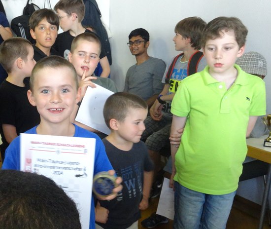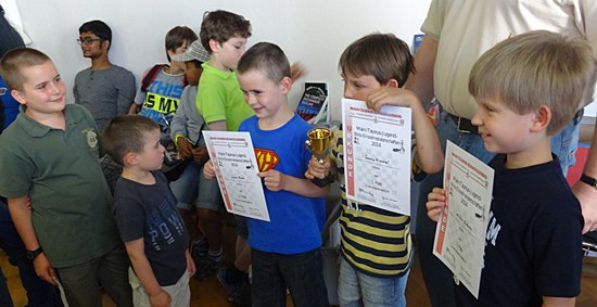 In der 12er-Gruppe der U10 gab es schließlich ein spannendes Rennen zwischen dem Bad Sodener Andreas Haller und der Westlerin Anastasija Edelmann, welches am Ende bei jeweils 9:2 Punkten in einem toten Rennen endete trotz der besseren Wertung 44,0 zu 42,0 Sonnenborn-Berger zugunsten des Bad Sodeners. Ein Stechen war angesagt mit zwei Partien. In sehr wechselvollen Verlauf endete die 1.Partie mit einem 1:0 für Anastasija, aber in der 2.Partie glich Andreas mit einem schönen Matt aus. Auf Vorschlag des Chess Tigers Team-Kapitän Hans-Walter Schmitt wurde aus Gründen der fortgeschrittenen Zeit und der Tatsache, dass beide den Sieg verdient hätten, auf zwei Sieger entschieden. Andreas bekommt den Pokal in der nächsten Woche noch nachgeliefert. Beide Kinder waren sichtlich mit der Entscheidung mehr als glücklich.