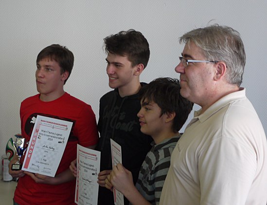 Mit Urkunden v.l.n.r: Anton Pyshny SC Eschborn, Sieger / Ruben Rittberger, SC Bad Soden, 2.Platz / Aaron Arnold, SC Frankfurt-West, (3.Platz). Rechts: Turnierleiter Günter Weber.