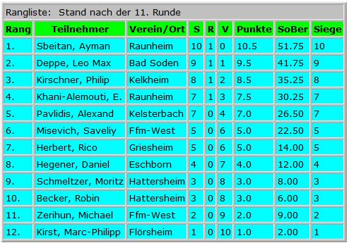 Es wurde einrundig gespielt mit insgesamt 11 Partien je Teilnehmer.