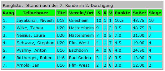 Es wurde doppelrundig in einem Turnier die Altersklassen U16 / U18 / U20 gespielt mit insgesamt 12 Partien je Teilnehmer.