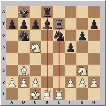 14…Te8 bringt den Turm ins Spiel und hebt die Fesselung des Springers auf. 15.Sa4 sieht Weiß etwas im Vorteil.