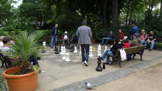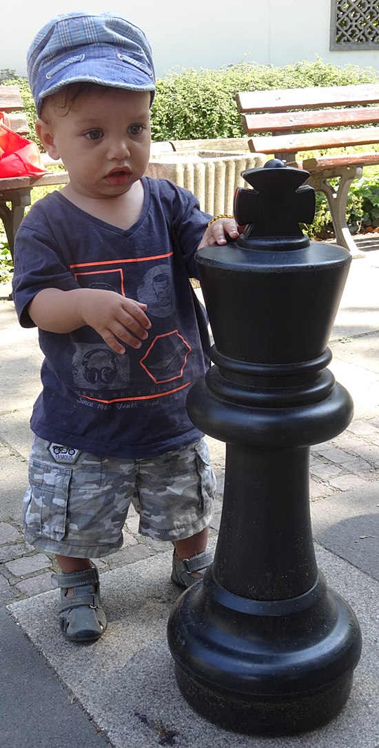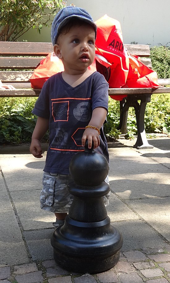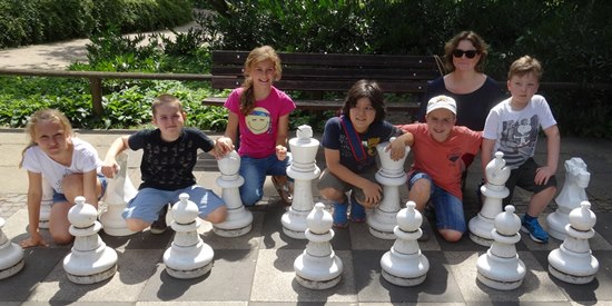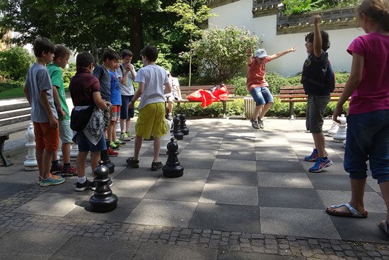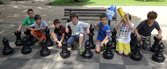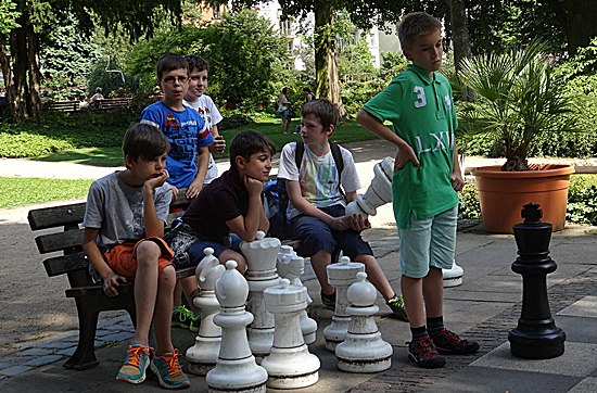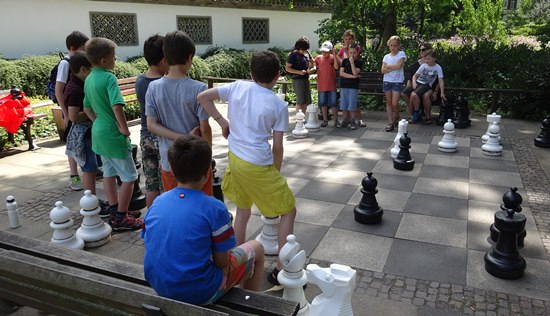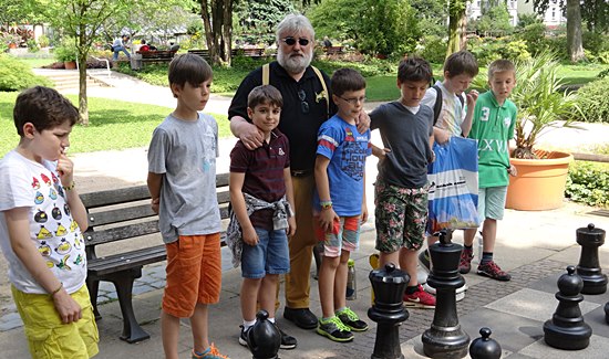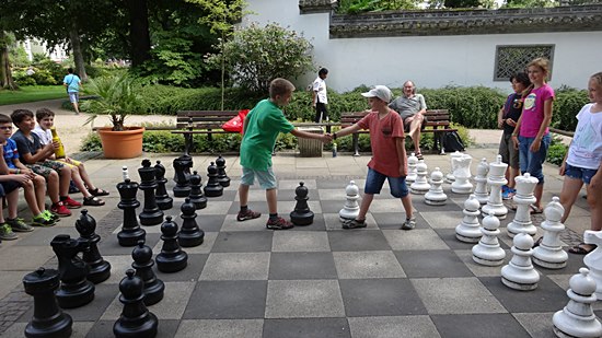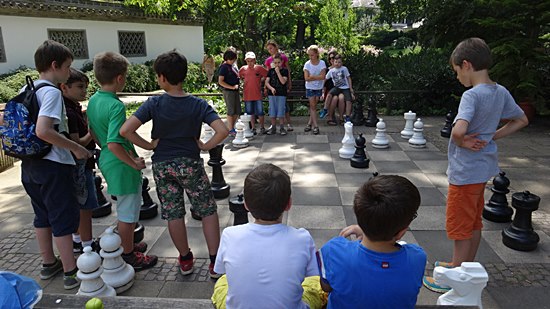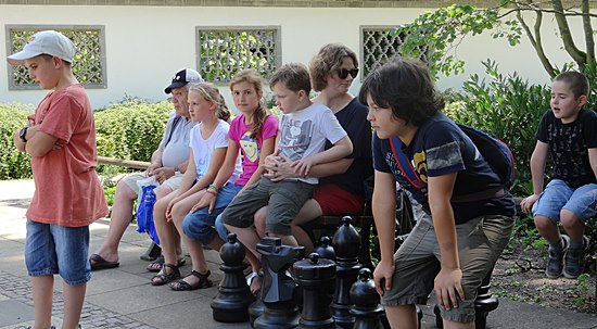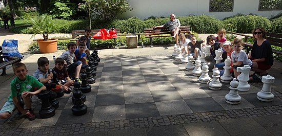 27.07.2014 - Einen überraschungsorientierten Donnerstagnachmittag wollten sich die Schüler der Schach-AG Fortsetzer "INTENSIV" zum Abschluss des langen Schuljahres gönnen. Die Anna-Schmidt-Schule genehmigte und die Leiterin Wiebke Neises begleitete die Schachaktivisten der Regel- und Montessori-Grundschule. Der Schachtrainer hatte eine soziale und gleichzeitig raffinierte Idee: "Zwei gestohlene schwarze Springer, ein weißer Springer und ein weißer und schwarzer Bauer waren durch uralte Figuren notdürftig ersetzt worden", sie sollten wieder ein einheitliches harmonisches Bild bekommen. Wir brachten die diplomatische Geste voll zur Wirkung und nahmen das Schachbrett dadurch in Besitz, trotzdem ließen die alten Herren uns noch 20 Minuten zappeln. Anstatt dreizügig "Matt" zu setzen mit Td6 oder Damengewinn, wurden die Figuren gegenseitig eingestellt, bis dann Moritz der Kragen platzte: "Wann kommen wir denn endlich dran" verstärkt durch des Trainers fachkundigem Kommentar: "Das ist doch totremis". Die älteren Freizeitspieler hatten endlich ein Einsehen und wir übernahmen mit zwei Teams das Brett, tauschten die abartigen Figuren aus und legten los! Italienische Partie, Greco-System war angesagt. Auf dem 20 minütigem Hinweg vom Gärtnerweg 29 zum Park hatten wir schon die Mannschaften gebildet. Die Kapitäne Pawel und Boris machten die Farbwahl und Boris zog 1.e4 in dieser historischen Beratungspartie im Bethmannpark.