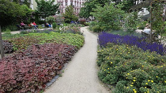 Wiesen, Spalierrosen, alte Baumbestände, erholsame Augenblicke der Stille zwischen angedeuteten Häuser-Silhouetten und unsichtbar rauschendem Verkehr ...