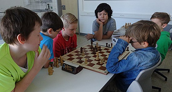 Realistische Einschätzung beim Team Pawel, man sieht die resignierende Körpersprache, die auch klar macht, dass die Schüler während der Partie bereits über ein gutes Stellungsgefühl verfügen. Sie wissen schon, welche Chancen eine Partie noch bietet, diese ist jetzt zum Aufgeben. Moritz: "Das nächste Mal wird es anders herum laufen", Boyan: "Hauptsache wir dürfen dabei sein" und dann werden wir sehen. "Ihr habt dann Schwarz" ist doch klar im Rückkampf"!