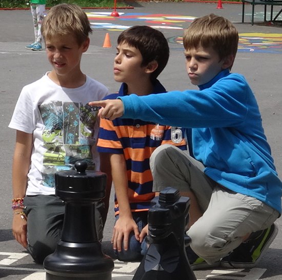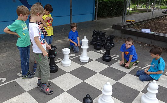 Nach drei Jahren erfolgreichem Schulschach gehen wir nächstes Jahr ins vierte Jahr, sodass wir den kompletten Grundschulzyklus eines Schülers mit ihm durchlaufen haben. Die Prototypen sind Andreas, Christian, Georg, Oskar und Simon. Im Frühjahr kam jetzt dieses Freiluftschach dazu, um jedem sichtbar zu machen: "Hier hat das Schach ein zuhause". Die Schulleiterin Frau Annette Rosenstock und die Schulkinderhaus 1 Leiterin Frau Cornelia Schmitt folgten gerne den Argumenten "Pro-Schach" der Chess Tigers. Dienstags ist der Chef Hans-Walter Schmitt selbst am Werk und donnerstags unterrichtet sein Kollege Mike Rosa. Das Schulkinderhaus 1 der GSS ist die Geburtsstätte des Chess Tigers Training Centers - vielen Dank Conni & Uschi im Namen der Tiger!
