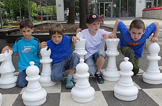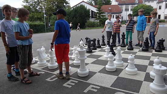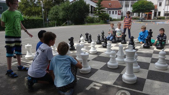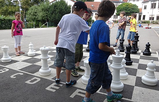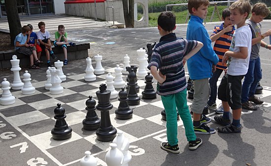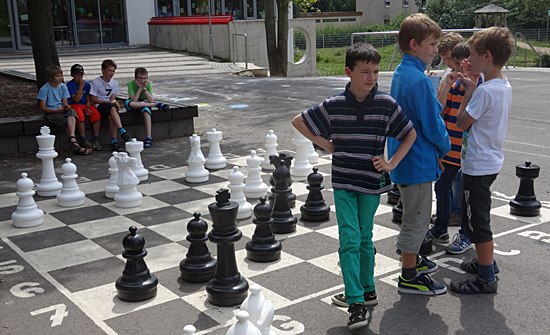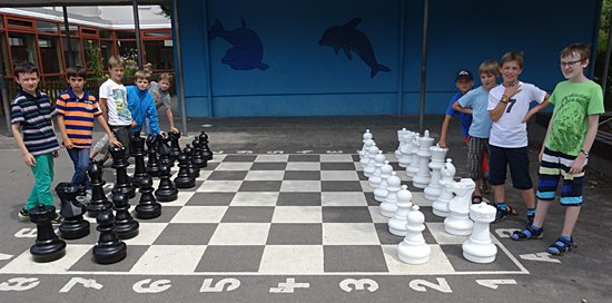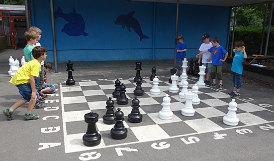 Schulschach Geschwister-Scholl-Schule Schwalbach - Brutstätte und Schachparadies Kreatives Schulkinderhaus, großer Schulhof, stille Leseinsel, Pokalschrank und jetzt das neue Freiluftschach heißen das Schach in Schwalbach herzlich willkommen!