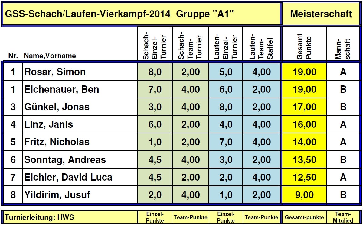 Schachspielen und Schnelllauf und dies im Einzel- und mit der Mannschaft, ergibt am Schluss die Rangliste der Geschwister-Scholl-Schule Schwalbach in der Meisterschaft 2014. Meister wurden punktgleich Simon Ursus Rosar & Ben Eichenauer - Gratulation!