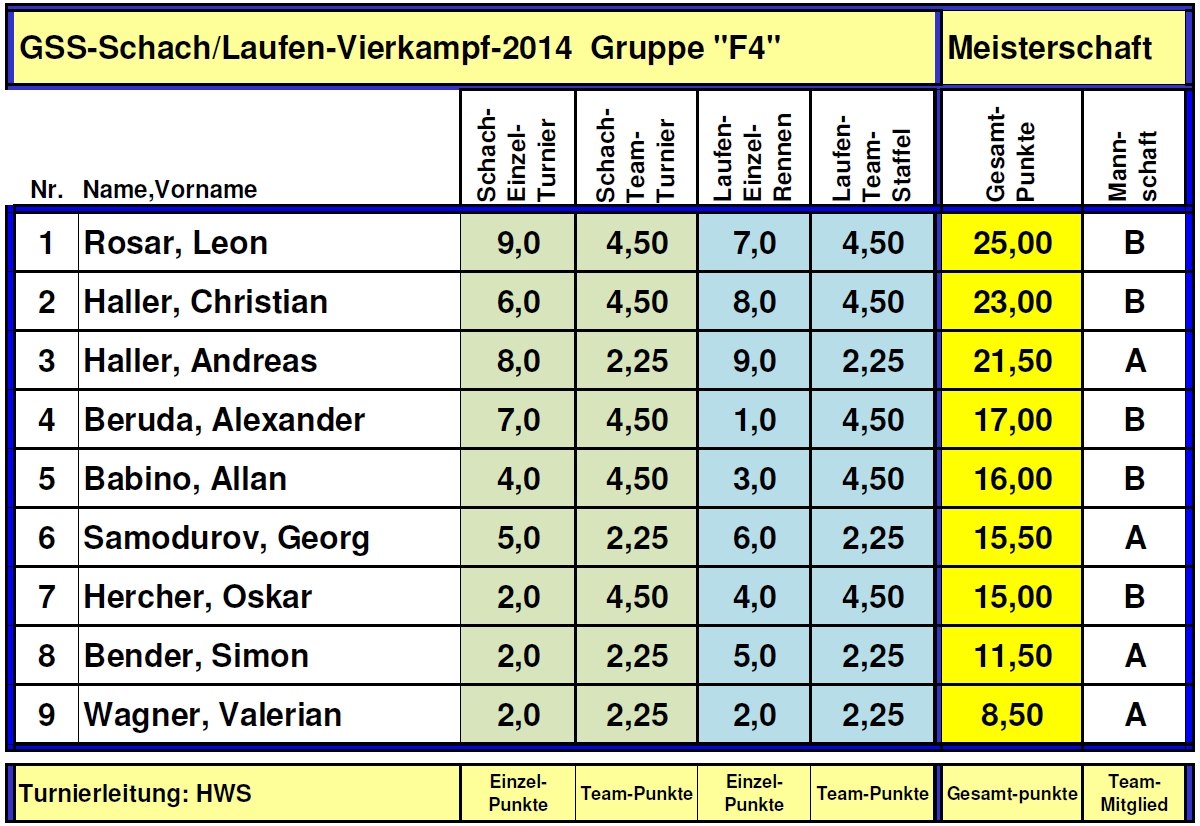 Die Turniertabelle F4 "Vierkampf" vom 22.Juli 2014 Klicken Sie auf die Tabelle für eine größere Ansicht.