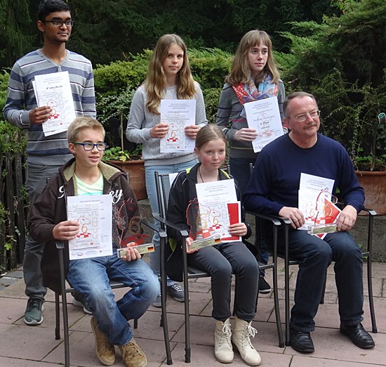Sieger der Klasse "D" Sitzend von links nach rechts: Leon Hollmann (4,5/5 / SC Bad Soden), Annmarie Mütsch (4,5/5 / SC Eppingen) und Gerhard Späht, (4,0/5 / SC Burtafingen). Stehend von links nach rechts: Nivesh Jayakumar (4,0/5 / SC 1934 Ffm.-Griesheim), Katharina Reinicke (4,0/5 / SK Langen) und Estelle Morio (4,0/5 / SK 1972 Hauenstein).