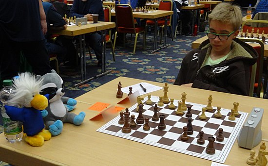 Viele Wettkampfgegner In der letzten Runde traf Leon auf die punktgleiche Annmarie Mütsch vom SC Eppingen, hatte die bessere Wertung und den Anzugsvorteil, sah sich aber einer DWZ-stärkeren Gegnerin mit ihren sorgfältig trappiert helfenden Plüschtieren gegenüber und einigte sich im Mittelspiel auf Remis!