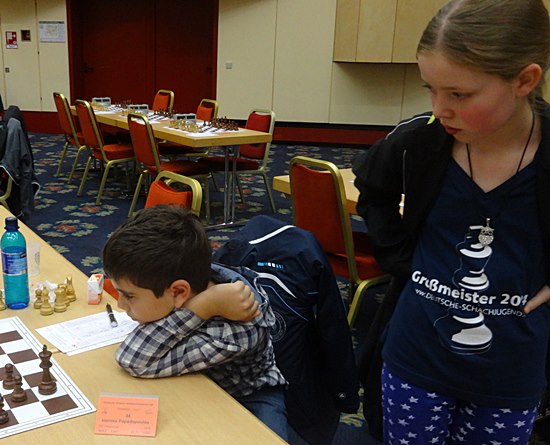 Die finale Gegnerin in der 5.Runde Hier beobachtet Annmarie Mütsch einen weiteren Chess Tigers Schüler "Ioannis Papadopoulos" vom SV Oberursel.