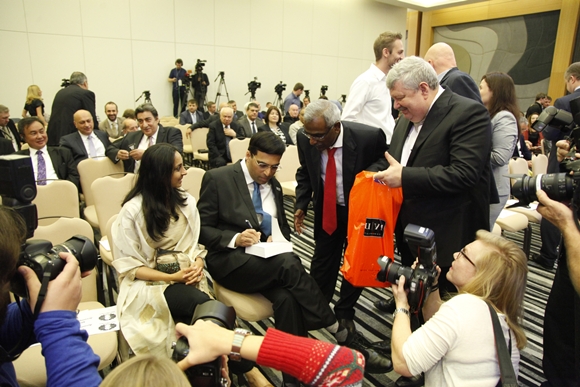 Den ersten Zug durfte der Berater des russischen Präsidenten Igor Levitin in Anwesenheit von FIDE Präsident Kirsan Ilyumzhinov ausführen. Natürlich passte ganz rechts Chef-Schiri Andrzej Filipowicz (76) wachsam auf, dass es nichts zu beanstanden gab.