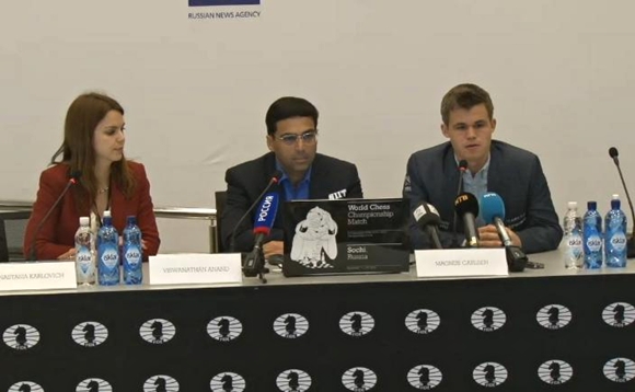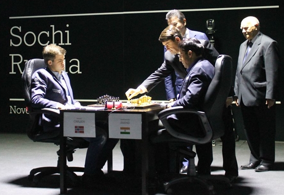 08.11.2014 - Punkt 13 Uhr unserer Zeit hat heute im russischen Sochi (oder auch Sotschi) die World Chess Championship 2014 zwischen Weltmeister Magnus Carlsen und Herausforderer Viswanathan Anand begonnen. Der Inder begann selbstbewusst und schnell, während sein norwegischer Gegner im Grünfeldinder alsbald erste längere Berechnungen durchführen musste. Der Titel dieses Berichtes ist das Zitat eines Users von der Live-Übertragung auf dem Fritz-Server von ChessBase, wo die WM gleich in vier Sprachen (Deutsch, Englisch, Französisch & Spanisch) begleitet wird. Besagter User traf den Kern der ersten Partie. Zugebissen hat der Tiger von Madras zwar nicht, aber etwas gefaucht und seine tödlichen Krallen gezeigt. An der einen oder anderen Stelle hätte Vishy vielleicht aggressiver vorgehen können, doch unter dem Strich steht ein Remis, auf welchem er aufbauen kann. Dass er im Schwerfigurenendspiel unnötig in Bedrängnis geriet, wird ihm bestimmt eine Lehre sein. Gegen diesen Carlsen darf man niemals die Konzentration verlieren! Am Sonntag muss dieser zeigen, welche Pfeile er in seinem Weißköcher hat. Ab 13:00 Uhr können Sie über multiple Wege live am Geschehen teilnehmen. Für deutsche Kommentare empfehlen wir den bereits erwähnten Fritz-Server, wo nach heute GM Thomas Luther morgen GM Karsten Müller und IM Oliver Reeh das Wort haben werden. GM Klaus Bischoff wird erstmals zu Partie 4 für Sie live on air sein.