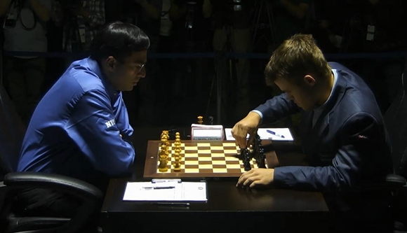 11.11.2014 - Heucheln wir nicht lange Objektivität, Viswanathan Anand ist ein Chess Tiger im wahrsten Sinne des Wortes, und heute ist für uns ein Tag zum Jubeln. Aus der Eröffnung heraus überspielte Vishy den amtierenden Weltmeister mit einer offensichtlich vorweg präparierten Variante im Damengambit. Carlsen wich von der ersten Partie ab und verzichtete auf Grünfeldindisch - jetzt wird er es möglicherweise bedauern. Bis zum 20. Zug folgte man der Partie Aronian gegen Adams aus dem Vorjahr, dann packte Anand eine Verbesserung für Weiß aus, mit welcher der Titelverteidiger in Folge gar nicht zurechtkam. Der Herausforderer platzierte einen mächtigen Freibauern auf c7, der Schwarz derart lähmte, dass ihm bald Zeit und Ideen ausgingen. Als Carlsen den Bauern endlich einkassieren konnte, musste er sich dafür entscheidend fesseln lassen. Nach 34 Zügen quittierte er die erste WM-Niederlage seiner noch immer jungen Karriere. Damit steht es 1,5:1,5, und das Match ist wieder offen. Am Mittwoch werden wir sehen, wie der Norweger mit Niederlagen umgehen kann. Die vierte Partie wird auf dem Fritz-Server von ChessBase dieses Mal von GM Klaus Bischoff in deutscher Sprache live kommentiert.