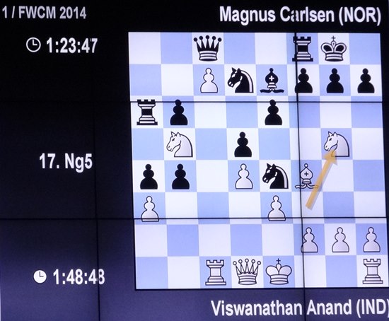 Der Kampf beginnt langsam spannend zu werden. Beide sind schnell und in bekanntem Fahrwasser. Kommentar aus Baden-Baden: Christan Bossert (war 2010 in Sofia im Team) und GM Arkadij Naiditsch (Deutschlands Spitzenspieler seit Jahren und Bezwinger Carlsens in Tromsö 2014) "Das ist eine sehr gute Eröffnungswahl von Vishy, du spielst mit Weiß auf zwei Ergebnisse. Sieg oder Remis". Aber beim amtierenden Weltmeister Carlsen weiß man nie, er scheint "neun" Leben zu haben, man muss ihn sauber besiegen, genauso wie den Computer Deep Blue! Weches auch dem stärksten Spieler aller Zeiten Gary Kasparov nicht mehr am Schluss gelang!