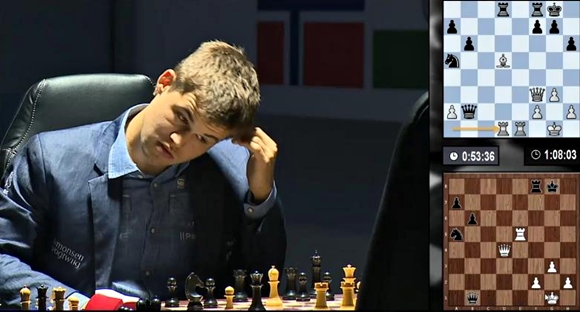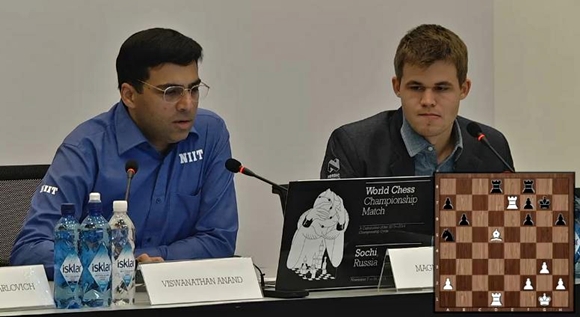14.11.2014 - Auch seine dritte Weißpartie eröffnete Viswanathan Anand mit 1.d4, und wieder wählte Magnus Carlsen eine andere Eröffnung. Dieses Mal versuchte er sich an Damenindisch, aber auch damit konnte er den Herausforderer nicht wirklich überraschen. Zügig tauschte sich Klötzchen um Klötzchen, bis der Weltmeister mit 22...Dxb2?! unnötiges Risiko ging. Sein indischer Herausforderer erhielt das bessere Endspiel, wickelte aber in der Folge schnurstracks ins Remis ab. Die letzten 10 Züge wurden quasi im Blitztempo absolviert, und nach nur 2,5 Stunden war die Partie vorüber. Damit steht es 2,5:2,5, und Carlsen darf in den nächsten beiden(!) Partien die weißen Steine führen.