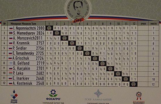 1. Shakhriyar Mamedyarov mit 16,0 Punkten aus 22 Partien, 2. Alexander Grischuk 15,5/22, 3.Boris Gelfand 12,5/22, 4. Sergey Karjakin 12,5/22, 5. Alexander Morozevich 12,5/22, 6. Peter Svidler 12,0/22, 7.Ian Nepomniachtchi 11,0/22, 8. Vladimir Kramnik 10,5/22, 9. Peter Leko 10,0/22, 10. Ernesto Inarkiev 9,5/22, 11. Evgeny Tomashevsky 8,0/22 und 12. Alexandra Kosteniuk 2,0/22.