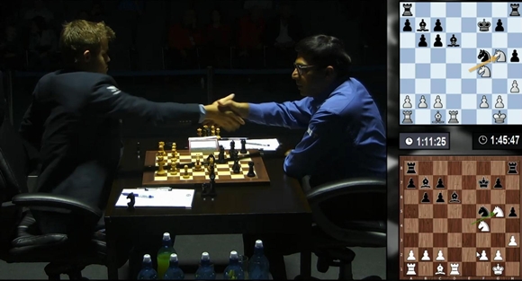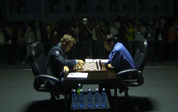 20.11.2014 - Die 9. WM-Partie endete nach nur rund einer Stunde Spielzeit und 20 Zügen mit einer dreimaligen Stellungswiederholung remis. Wie Magnus Carlsen zugab, musste er sehr früh einsehen, dass Viswanathan Anand bestens vorbereitet war und dieses Mal im Berliner Endspiel (oder Mittelspiel ohne Damen?) mühelos ausglich. Offensichtlich scheute der Weltmeister das Risko und nahm lieber den halben Punkt mit, statt wie sonst im Trüben zu fischen. Dass beide Seiten mit diesem Partieverlauf glücklich sind, wäre eine ziemliche Übertreibung, aber sie können gut damit leben. Carlsen hat eine Weißpartie "verschenkt", Vishy dafür den Rückstand nicht aufgeholt, dafür ist der Norweger eine Partie näher an der Titelverteidigung, der Inder hat hingegen 2:1 Weißpartien übrig, um das Blatt noch zu wenden. Mit großer Spannung warten wir nun auf die 10. Partie am Freitag. Schon jetzt ist klar, dass es in Sochi mehr Partien geben wird als in Chennai, und wer weiß, vielleicht gibt es am Ende sogar einen anderen Sieger. Der große Garry Kasparov persönlich twitterte jedenfalls nach der Partie: "Kurzremisen mit Weiß sind Verrat an Caissa, und das mag sie gar nicht!"