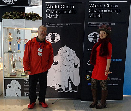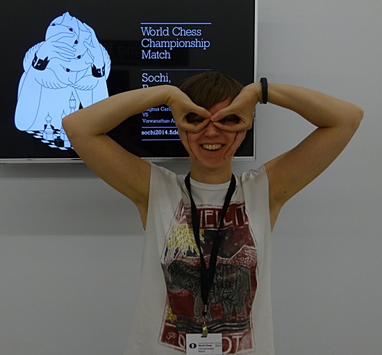 Gerne posierte sie für die Chess Tigers und überraschte mit Detailwissen, über das was wir tuen und was wir in den vergangenen 20 Jahren getan haben. "Von Kasparov bis Anand, von Spassky bis Unzicker und schließlich von Anand bis Carlsen - ich war verblüfft! Bei acht Weltmeisterschaften wäre ich schon an Anands Seite dabei gewesen? Stimmt tatsächlich - die hat wirklich den Durchblick! Groningen/Lausanne (1998), New Delhi/ Teheran (2000), Mexiko (2007), Bonn (2008), Sofia (2010), Moskau (2012), Chennai 2013) und nun Sochi (2014).