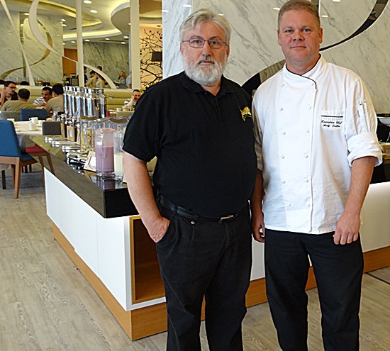 "Büffel Mozarella ist aus", da ließ ich den Chefkoch kommen und seither verstehen wir uns in Russland blendend. Der Mann aus Deutschlands Osten, Andy Triller (Chemnitz), und der Mann aus Deutschlands Westen, Hans-Walter Schmitt (Bad Soden am Taunus).