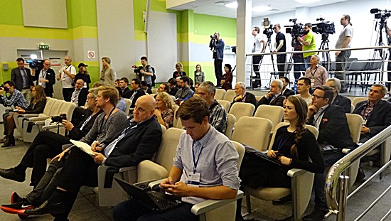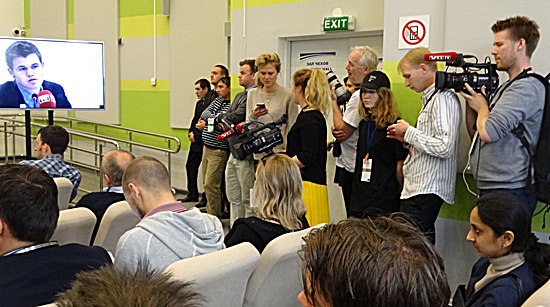 Der Raum war gut gefüllt, viele natürlich interessierte Russen, zwei Inder, zwei Deutsche, ein Spanier, ein Amerikaner und bestimmt zwei Dutzend Norweger demonstrierten eine quantitative Überlegenheit - 50% Live-Übertragungszuschauer bringt hoffentlich die norwegische Wirtschaft nicht ins Schwanken. Magnus Carlsen will den deutschen Markt erobern, deshalb mal den Termin von 2.-9.Februar 2015 für Weltklasseschach in Baden-Baden freihalten.