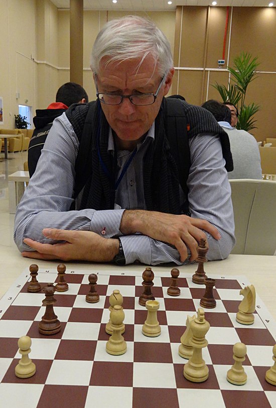 ... sitzt am Brett und analysiert das "Damenopfer", welches ihm der Schreiber dieser Zeilen gestern im Expo Centrum präsentierte in einem recht frühen Stadium des "Budapester Gambits" mit Weiß spielend.