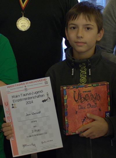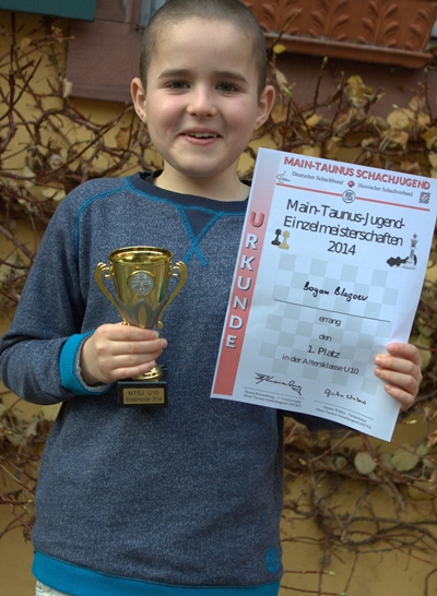 24.11.2014 - Am Sonntag wurde nicht nur die Schach-WM entschieden, für zahlreiche Schachjünglinge ging es in Hattersheim bei den Main-Taunus-Schachjugend--Einzelmeisterschaften der Altersklassen U12, U10 und U8 ebenfalls hoch her. Gespielt wurden jeweils 7 Runden Schweizer System mit 20 Minuten Bedenkzeit. Das größte Kontingent an jungen Schachschülerinnen und Schülern stellte der SC Bad Soden. Unterrichtet werden die meisten dieser Kinder von Trainern des Chess Tigers Training Centers - so auch unser Sensationssieger in der U10, Boyan Blagoev. "Läuft bei Dir" ist laut Langenscheidt ab sofort Jugendwort bzw. -satz des Jahres und soll hier eindeutig "Du hast es drauf!" bedeuten. Mit unglaublichen 7 aus 7 fegte Boyan durch das 28-köpfige Feld - in keiner Partie geriet er in ernste Verlustgefahr, was auf diesem Niveau wahrhaftig sensationell ist. Ganz stark war auch der Auftritt unseres Jan Werndl in der U12. Erst im finalen Stichkampf musste er sich Marius Bajorski beugen, doch die Freude über den Silberrang überwog zum Glück recht bald wieder. Die Bad Sodener Medaillenpalette komplett machte Patrick Olshansky mit seinem dritten Rang in der U8. Der bärenstarke Sonny Kimmel aus Kelsterbach siegte dort mit 7/7! Bisher wurden leider noch keine Tabellen veröffentlicht, weshalb ein ausführlicher Bericht noch etwas warten muss. Dort muss unbedingt auch die Anwendung der geänderten FIDE-Regeln besprochen werden. Macht es Sinn, dass in diesen Klassen auch beim Schnellschach ein unmöglicher Zug sofort verliert?
