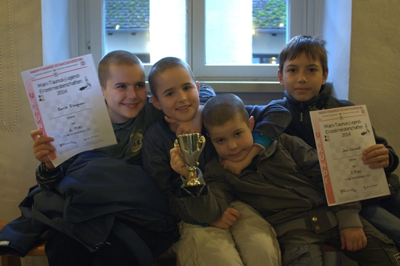Hier nochmals unser U10-Meister und U12-Vize zusammen mit Boyans Brüdern. Boris spielte ebenfalls in der U12 und wurde sehr guter Sechster, und der kleine Dejan (im Würgegriff, weil er den Pokal nicht mehr rausrücken wollte) kennt nur ein Ziel: Ich will auch Chess Tiger werden!