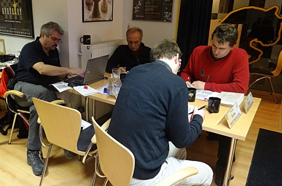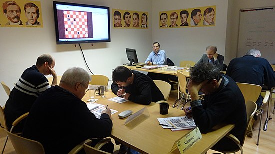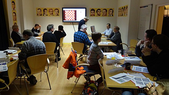 GM Dr. Karsten Müller ist immer präsent und hat auch während der Aufgaben-Lösungsphase ein Auge drauf und steht für Verständnis-Fragen allzeit bereit. Die sechs Aufgabenzettel führen am Ende des Seminars zum Gesamtergebnis und entscheiden über die Reihenfolge der Vergabe der mitgebrachten Preise, die die Firma ChessBase zur Verfügung stellte. Meistens ist es eine DVD für € 29,90 und oft hochaktuell, sogar aus der "Neuigkeitenliste" zu Weihnachten 2014. Herzlichen Dank im Namen unserer "Müller"-Studenten an den ChessBase-Nikolas oder war es doch das ChessBase Christkind in der Vorgeschenk-Phase. Allerdings sind auch eine ganze Menge ChessBase13-Megapakete und Updates neben Komodo 8, DeepFritz 14, Rybka 4 und Houdini 4 die Nachhausetragetasche gewandert.