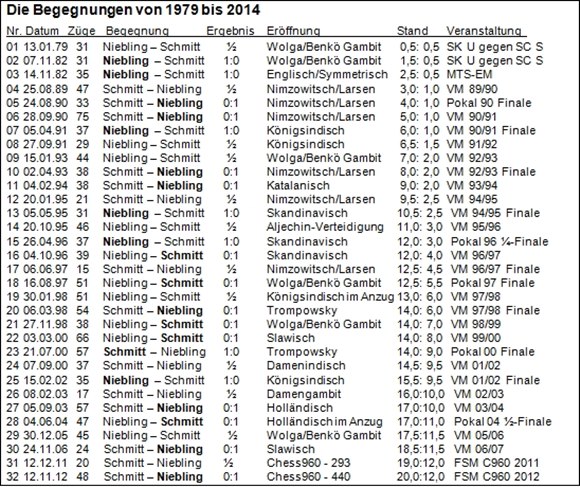 Eine durchschnittliche Zügezahl von 40, 12 Remis, davon nur zwei unter 20 Züge, bei 20 entschiedenen Partien (+14/=12/-6 für Niebling) zeugen nicht offenbar von großer Freundschaft, aber der hohe gegenseitige Respekt lässt einfach keine kurzen Partien zu, es wird durchgehend mit allen Finessen gekämpft. Beachtlich ist auch das Weiß-Schwarz-Sieg Verhältnis mit 7:13 – hat Niebling mit 6:8 noch eine moderate fast ausgeglichene Bilanz, so ist sie bei Schmitt mit 1:5 extrem schwarzlastig. Beide sind bekannt dafür, dass sie nicht über so extrem harte Weißaufschläge verfügen, sondern eher zu den erfolgreich agierenden Schwarzspezialisten gehören, vor allem wenn es in der Mannschaft um Punkte geht. Dabei zeigt die Weiß-Schwarz Farbverteilung insgesamt mit 17:15 einen kleinen Vorsprung für Niebling. Beim Pokalhalbfinale im Jahre 2004 hatte Ferdinand wieder einmal mit Weiß spielend eine Neuerung für mich parat, aber sein 1.f4 passte aus meiner Sicht so gar nicht zu der seriösen Art und Weise, wie er seine Partien sonst zu gestalten pflegt – für mich war es eher eine richtig erhoffte Überraschung.