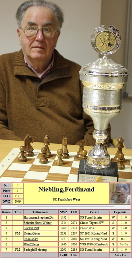 Nachrichten Ferdinand Niebling - Grandseigneur des Schachs wird 80! Das Gründungsmitglied der Chess Tigers Ferdinand Niebling wird zum >> Ehren-Tiger << ernannt. Heute wird geehrt und gefeiert in Hofheim