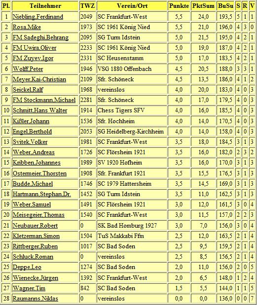 Wie überraschend schließlich der damalige Achtungserfolg gewesen sein musste, zeigt sich sehr deutlich-an der obenstehenden Statistik. Dauerte es doch bis zum 4.Oktober 1996 – geschlagene 17 Jahre – bis der Jüngere mit dem allerersten Sieg diesen „verfluchten“ Bann durchbrechen konnte. Schienen bis zu diesem Tag nicht nur die Erfahrung und das Können für den Partieausgang ausschlaggebend zu sein, nein, zu allem Unglück schien auch Caissa treu an der Seite des Besseren zu stehen – ziemlich einfach machte es sich da die Schachgöttin! Doch einmal mit Brachialgewalt diesen Bann durchbrochen, schloss Sie auch den Jüngern in ihr Herz und lächelte ihm in der kürzeren Vergangenheit öfters freundlich zu. Mittlerweile bereitet es mir einen Heidenspaß, wenn es zu den alljährlichen Begegnungen mit dem Grandseigneur des Schachklubs Frankfurt-West kommt und es erfüllt mich mit stolzen Gefühlen, wenn Ferdinand Niebling über seinen „Angstgegner“ HWS spricht.