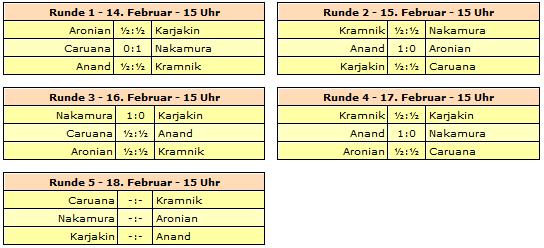 Zu guter Letzt tragen die Spieler am Tag nach Beendigung des Turniers am 19. Februar noch ein Schnellturnier mit vertauschten Farben aus.
