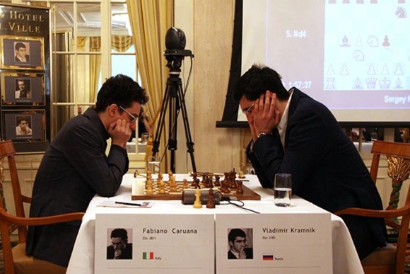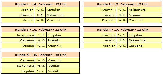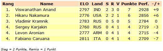 18.02.2015 - Mit drei Unentschieden endete die letzte Runde des Hauptturniers der Zürich Chess Challenge, welches somit von Viswanathan Anand gewonnen wurde. Ziemlich zeitig hatten zunächst Hikaru Nakamura und Levon Aronian alle Klötzchen abgetauscht und ein totes Bauernendspiel erreicht. Einige Zeit später folgten Fabiano Caruana und Vladimir Kramnik, die nur 28 Züge spielten, aber dennoch keine weitere Schnellpartie austragen brauchten. Der Turniersieger erlebte einige Auf und Abs gegen Sergey Karjakin, doch letztlich wurde auch hier die Remisbreite nie wirklich überschritten. Da die Punkte des Hauptturniers mit denen des morgigen Schnellschachturniers addiert werden, steht der endgültige Sieger in Zürich noch nicht fest. Und weil die Punkte des Hauptturniers doppelt gezählt werden, startet Anand morgen quasi mit einem Punkt Vorsprung. Beim Schnellschach werden die Punkte nämlich normal gezählt. Beginnen wird das Turnier um 13 Uhr. Für die Paarungen werden im Vergleich zum Hauptturnier einfach die Farben getauscht.