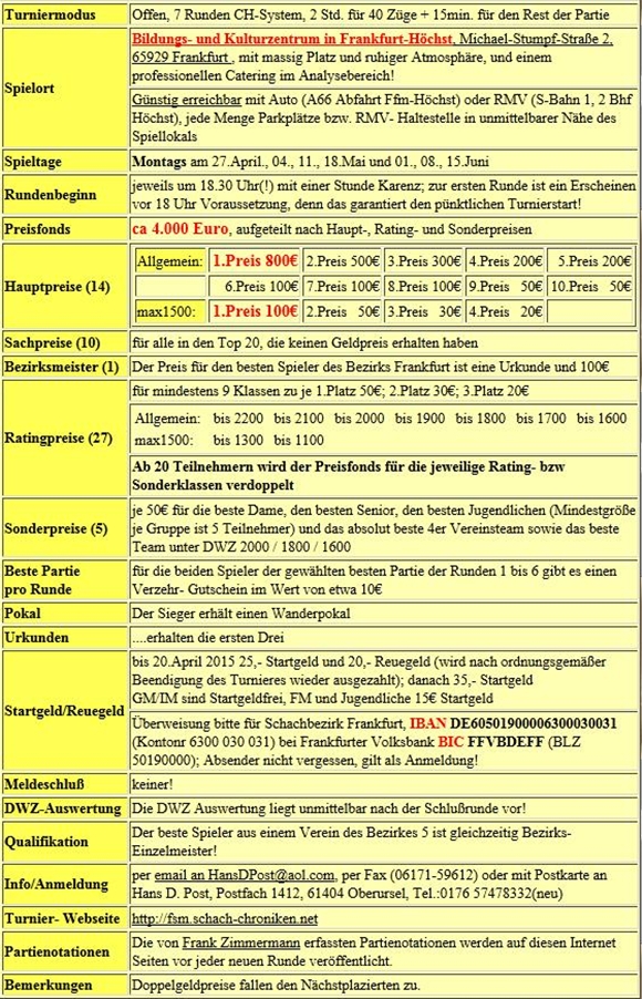 Nachrichten Frankfurter Stadtmeisterschaft 2015 beginnt am 27. April Der Titelverteidiger und sein Vize haben bereits gemeldet!