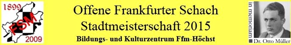Vor zwei Jahren wäre einer der bekanntesten Schachspieler der Region 100 Jahre alt geworden, der fünffache Frankfurter Stadtmeister Walter Jäger. So wie ihm das Turnier 2013 gewidmet wurde, ist diesmal der damals 19-jährige Student Otto Müller an der Reihe, sich seiner zu erinnern. Er wäre ziemlich genau auf den Tag zu Beginn der diesjährigen FSM 100 Jahre alt geworden. Doch alleine diese runde Zahl ist nicht der Grund, warum das Turnier 2015 den Zusatz "in memoriam Dr. Otto Müller" erhält. Den Rest erfährt man vor Ort!