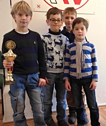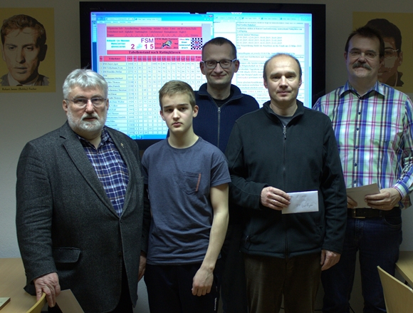 Die (anwesenden) Preisträger v.l.n.r.: Hans-Walter Schmitt (Senioren), Leo Deppe (Jugendliche), IM Stefan Reschke (Platz 3), FM Igor Ziuyev (Sieger) & Turnierleiter Hans-Dieter Post (gewann nix)