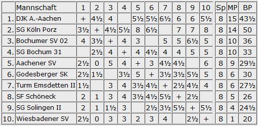 In der Westgruppe der 2. Bundesliga heißt es nun zittern für Schöneck, aber von einem Sieg gegen Porz oder einem von Wiesbaden gegen Godesberg konnte man auch nicht ausgehen. Die Landeshauptstädter sind damit auch wieder Oberligist. Schönecks Trumpfkarte für die Schlussrunde ist der jeweils schwere Gegner für Emsdetten bzw Godesberg, sodass auch ein jeweiliges Viervier diese nicht retten muss. Schöneck muss im entscheidenden Kampf gegen Wiesbaden ran, sehr eigenwillige Klasseneinteilung, und die werden doch wohl nicht den ersten Saisonsieg feiern wollen?