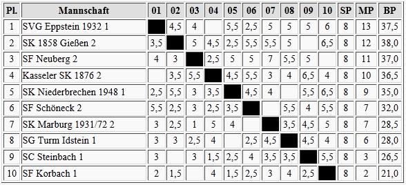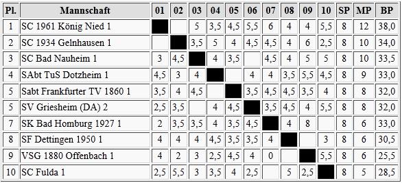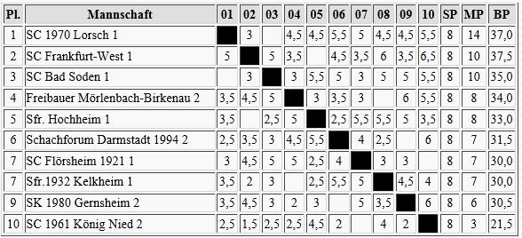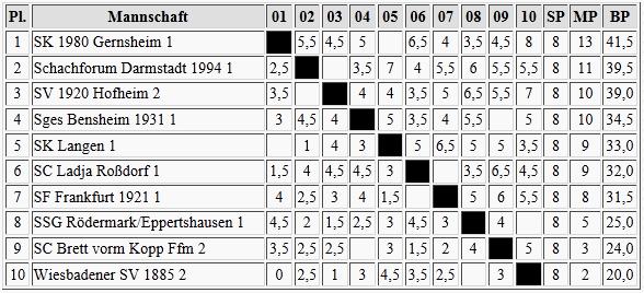 Schon wesentlich klarer sieht es dagegen im Süden aus, Gernsheim ist der Aufstieg kaum noch zu nehmen. Brett vorm Kopp und der Wiesbadener SV werden wohl in die Landesklasse absteigen müssen.