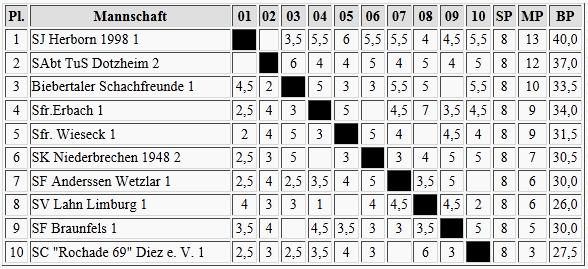 Ergebnisse mit Mannschaftsaufstellungen und üblichen Kreuztabellen wurden zeitnah zu den Runden veröffentlicht, jetzt nach Abschluss kamen noch einige Bilder und auch Einzelspielerlisten und Listen nach Vereinen aufgeteilt hinzu.