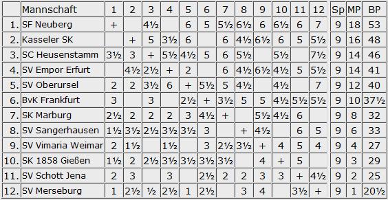 Hofheim, die Schwaben Hessens, sparen sich mal wieder um den Aufstieg und lassen beim zu leicht gewogenen Tabellenletzten Schmiden-Cannstadt einfach ein paar Leistungsträger zu Hause, und spielten lediglich Viervier. Adieu Bundesliga, sage ich da mal vorher, denn warum sollte Griesheim, die sich gegen Mainz keine Blöße gaben, die Württemberger unterschätzen? Bei Mörlenbach ist die Luft raus und auch im südhessischen Duell gegen Viernheim gab man beide Punkte ab. Da in der Schlussrunde der Tabellenführer wartet, war's das schon wieder mit der 2. Liga, und die Oberliga ruft!