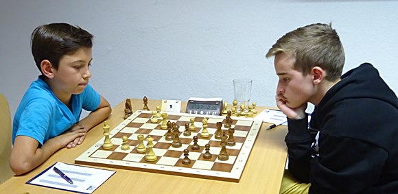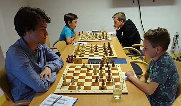 Die erste Generation der Chess Tigers Schüler spielten am längsten, kurz nach 20:00 Uhr standen die Sieger fest. Vorne: Ruben Rittberger versus Lukas Martin 1:0 und hinten: Jan Werndl versus Leo Deppe 0:1.