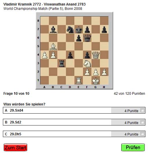 Wer danach noch tiefer in die meist breitgefächerte Analyse der Partie einsteigen möchte, kann sich die umfangreicher kommentierte Partie in den Probelektionen anschauen und dann natürlich auch als Privatperson, Verein, Schule oder Institut eine oder mehrere "Leistungsstufen" buchen - 40 Lektionen mit aktuellen lehrreichen Partien aus der jungen und jüngsten Vergangenheit sind im Studienjahr 2009/2010 zu erwarten.