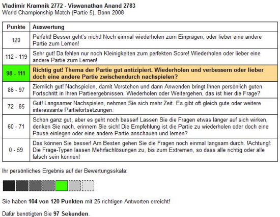Am Schluss, nach Beantwortung der letzten Frage, meistens 10 bei wichtigen Situationen in einer Partie, bekommt der trainierend Lernende das Ergebnis seiner Leistung angezeigt. Auf einer 7er-Skala bewertet wird er mit praktischen Tipps und Ratschlägen informiert und aufgefordert sein weiteres Training mit der Chess Tigers Methode zu gestalten.