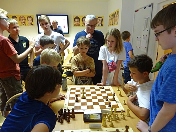 23.07.2015 - Wow, das war super spannend in der neunten und letzten Runde im Chess Tigers Training Center bei der Jugend-Blitz-Meisterschaft des SC Bad Soden und den Chess Tigers. Die 24 Teilnehmer hatten sich nach der achten Runde einigermaßen sortiert, nur auf den Medallienplätzen lagen mit 7:1 Punkten Adam, Leo und Leon ganz vorn, getrennt nur durch jeweils einen Punkt in der Tiebreak-Wertung "Punktesumme". Am Ende gewannen die beiden großen "L" und Adam musste gegen Kevin den Einwand "unmöglicher Zug" mit einer "Null" quittieren. Schade für den jungen Spieler der gerade vom SC Bad Soden zu den Schachfreunden Neuberg aus Entfernungsgründen wechseln musste, aber mit dem Chess Tigers Training will er weitermachen!