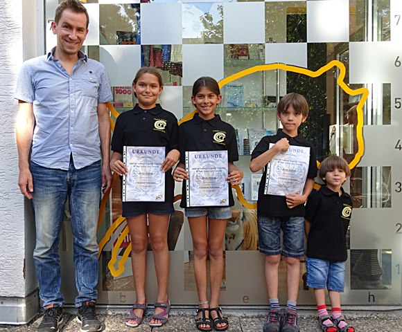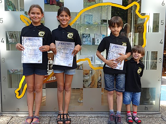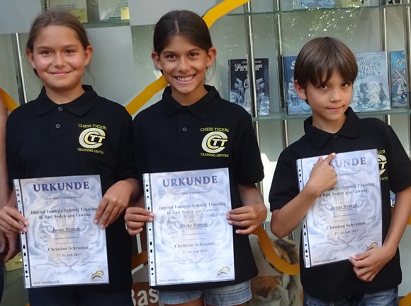 07.08.2015 - Familie Rempe, gebürtig aus dem hohen Norden Deutschlands und momentan in Phenix (Arizona) beruflich unterwegs gönnte seinen Kindern ein intensives 30-stündiges Schach-Training mit FM Christian Schramm im Chess Tigers Training Center in Bad Soden am Taunus. Morgens um Viertel vor Zehn wurden die drei Kinder gebracht und abends um kurz nach Fünf wurden sie wieder abgeholt, um anschließend im Vertragshotel der Chess Tigers Ramada die Abendstunden zu verbringen, allerdings musste noch vorher beim Besitzer "Gino" - dem Italienisches Restaurant "Gran Sasso" - noch die "Italienische, Spanische und Belgische"-Eröffnung Revue passieren. Der "Running Gag" entstand nach Erzählungen des Chef-Entertainers Hans-Walter, der immer für gute Stimmung sorgte: nach den Anfangszügen 1.e4 e5, 2.Sf3 Sf6, ist 3.Lc4 die Italienische, 3.Lb5 die Spanische und 3.La6 die belgische Partie! "Dann ist doch der Läufer weg", meinte Jonas, "eben" hieß die Antwort, "aber Du kannst auch immer mal ein anders Land einsetzen, wenn Du die ein bisschen ärgern willst".