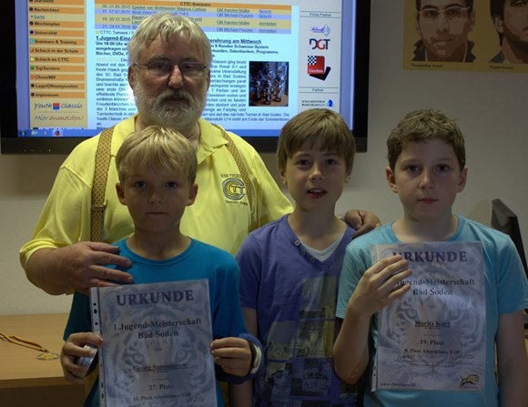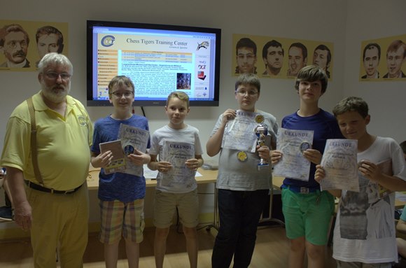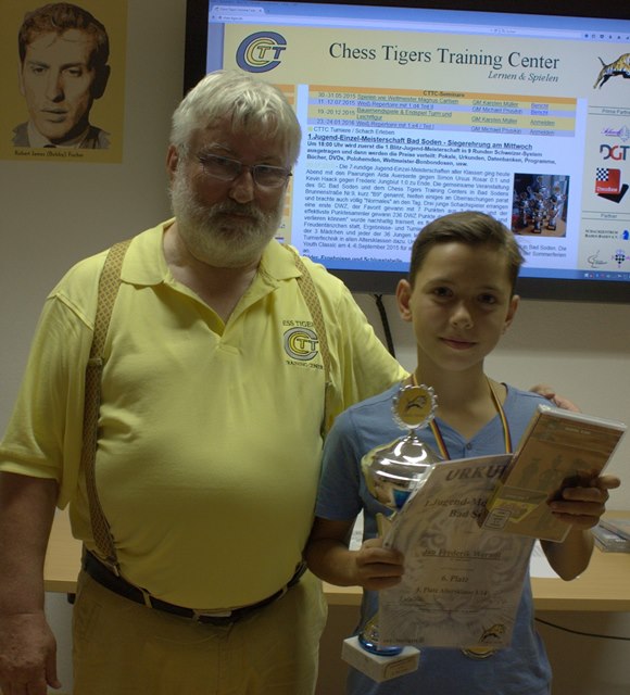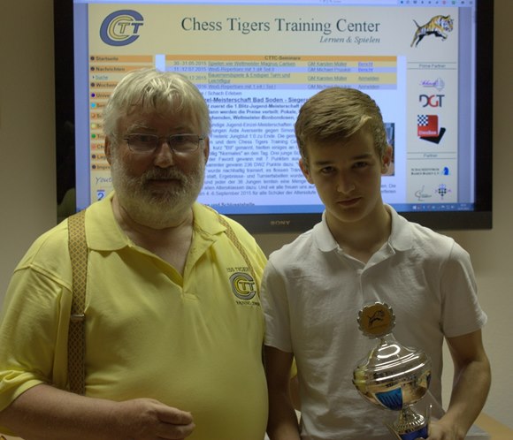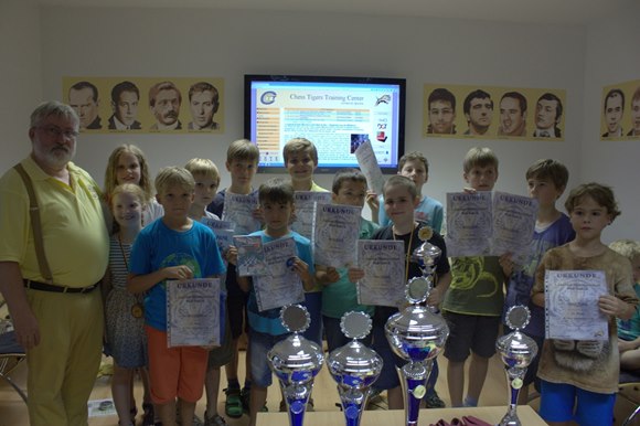 08.08.2015 - Die Bad Sodener Jugend-Einzel-Meisterschaften waren ein kleiner Meilenstein in der Entwicklung der jungen Schachspieler in Bad Soden. Mit 39 Teilnehmern in den Altersklassen U18 = 2, U16 = 2, U14 = 3, U12 = 10, U10 = 17 und U8 = 5 und sieben vergebenen Jugendmeistertiteln im klassischen Schach endete am 23.Juli 2015 mit der Siegerehrung des 7-rundigen Turniers. Die Austragung der Jugenmeisterschaft im Blitzschach, die nach sehr spannendem Verlauf in der letzten von 9.Runden Schweizer System entschieden, wurde auch noch 9-rundig mit 24 Schülern ausgespielt. Der souveräne klassische Meister und Gesamtsieger Leo Max Deppe hatte mit einem 100%-Ergebnis auch hier mit 8 aus 9 die Nase vorn, aber nur hauchdünn im Fotofinish vor Leon Hollmann. Nachdem die letzte Saison nun endgültig vorüber zu sein scheint, kommen jetzt schon die neuen Aufgaben auf unsere Jugendspieler zu. Am 4.-6.September geht es im vornehmen Neuenhainer Bürgerhaus im wichtigen Youth Classic Qualifier um die begehrten Plätze für das Youth Challenge und Youth Masters - Pokale, Urkunden und Preise im Werte von mehr als € 3.000,- sind attraktiv und ein großer Anreiz vor allem für unsere eigenen Spieler vom SC Bad Soden, aber auch für alle Interessierten aus der Rhein-Main-Taunus Region, selbstverständlich aber auch aus dem ganzen Bereich des Deutschen Schachbundes! Eine Woche später am 13.September gibt es die Bürgermeisterwahl, in der der schachafine Titelverteidiger Norbert Altenkamp aussichtsreich ins Rennen geht und 14 Tage später am 27.September startet die Schachsaison 2015/2016. Ein Freiplatz für den SC Bad Soden in der Bezirksklasse C animiert die Macher Bettenbühl und Schmitt die Intensität der Jugendarbeit noch einmal konsequent zu erhöhen. Hans-Walter Schmitt wird mit einem Kader von gut zehn Jugendspielern U11/U10/U9 versuchen mit dem hoffnungsvollem Nachwuchs nachhaltige Teamerfahrungen zu sammeln und natürlich die Klasse zu halten. Die Trainer der Chess Tigers Familie GM Klaus Bischoff, FM Christian Schramm, Elmar Kaiser, Mike Rosa, Stefan Schmieder und Hans-Walter Schmitt werden jeden Tag ihre Jungs um ein (1) "DWZ" besser machen oder wie es der Marktführer "Messer" aus Bad Soden am Taunus zu sagen pflegt: "Voll Gas geben!"