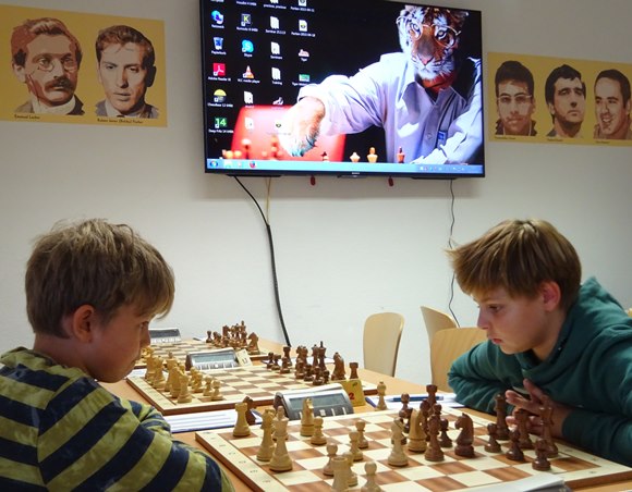 Jakob Gräf (SV Frankfurt-Nord 1926) gegen Daniel Senko (SC Bad Soden) im Chess Tigers Training Center