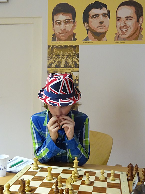 Unter den kritischen Augen der Weltmeister Viswanathan Anand, Vladimir Kramnik und Gary Kasparov unser spezielle Spieler mit Hut aus Großbritannien: Nils Lehmann vom SK Lahn Limburg.