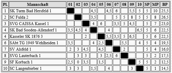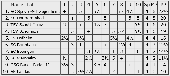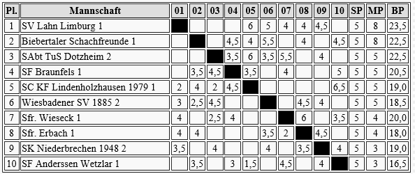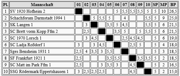 Gernsheim plant wohl einen sauberen Durchmarsch zum Oberligaaufstieg, jedenfalls folgte schon der 5. Sieg in Serie. Wenn da nicht das schlechte Brettpunktkonto wäre, könnte der Frankfurter TV auch noch ein Wörtchen mitreden, aber ich schätze, das wird zu knapp.